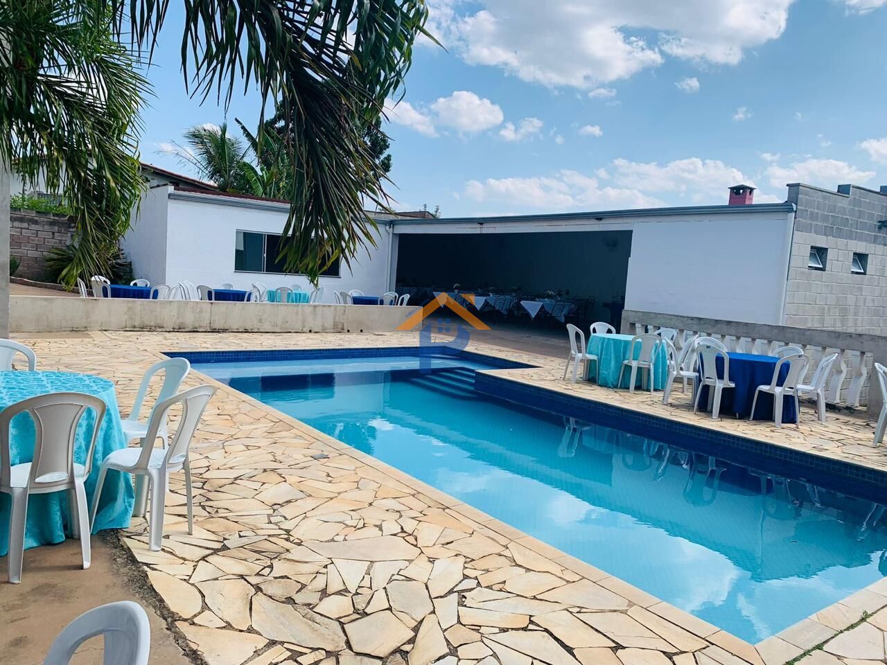 Salão de Festa acompanha 13 jogos mesas com 4 cadeira, 24 cadeiras amarelas, mesa grande, frízer, geladeira e fogão industrial de 4 boca. Salão-100m2 (E) Capacidade para 100 - pessoas.